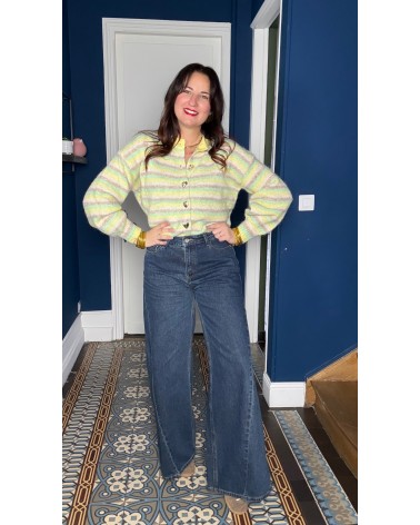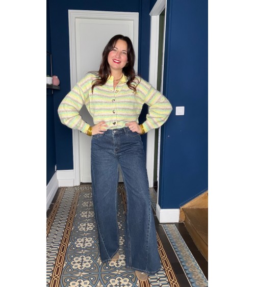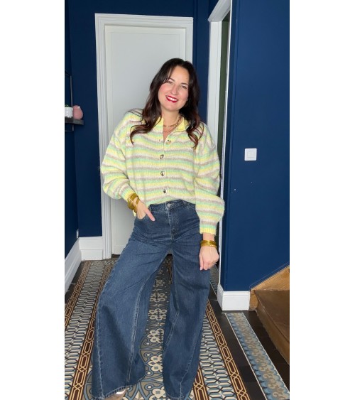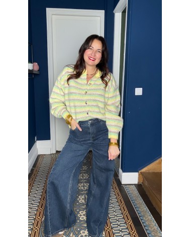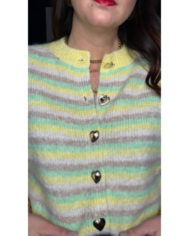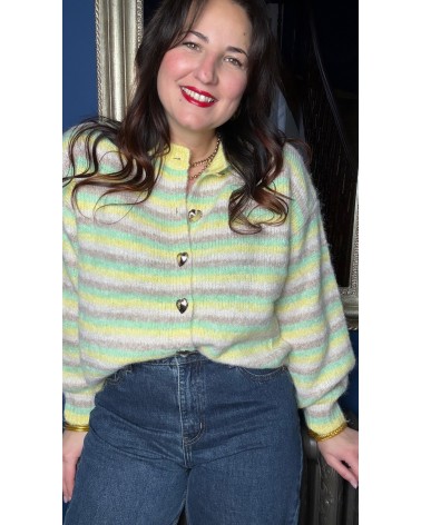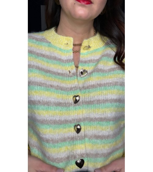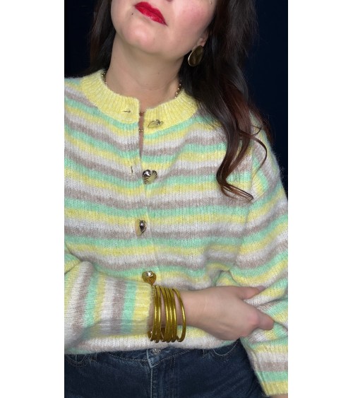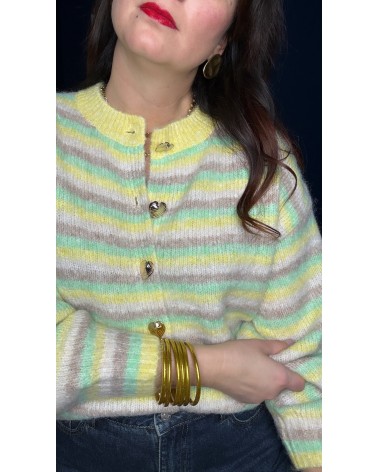 Gilet à rayures jaunes, vertes, beiges et taupes